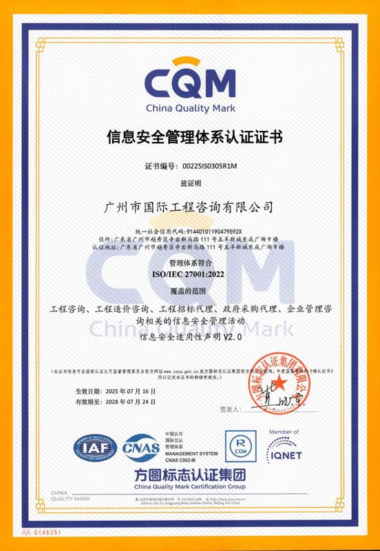 信息安全管理體系認證證書