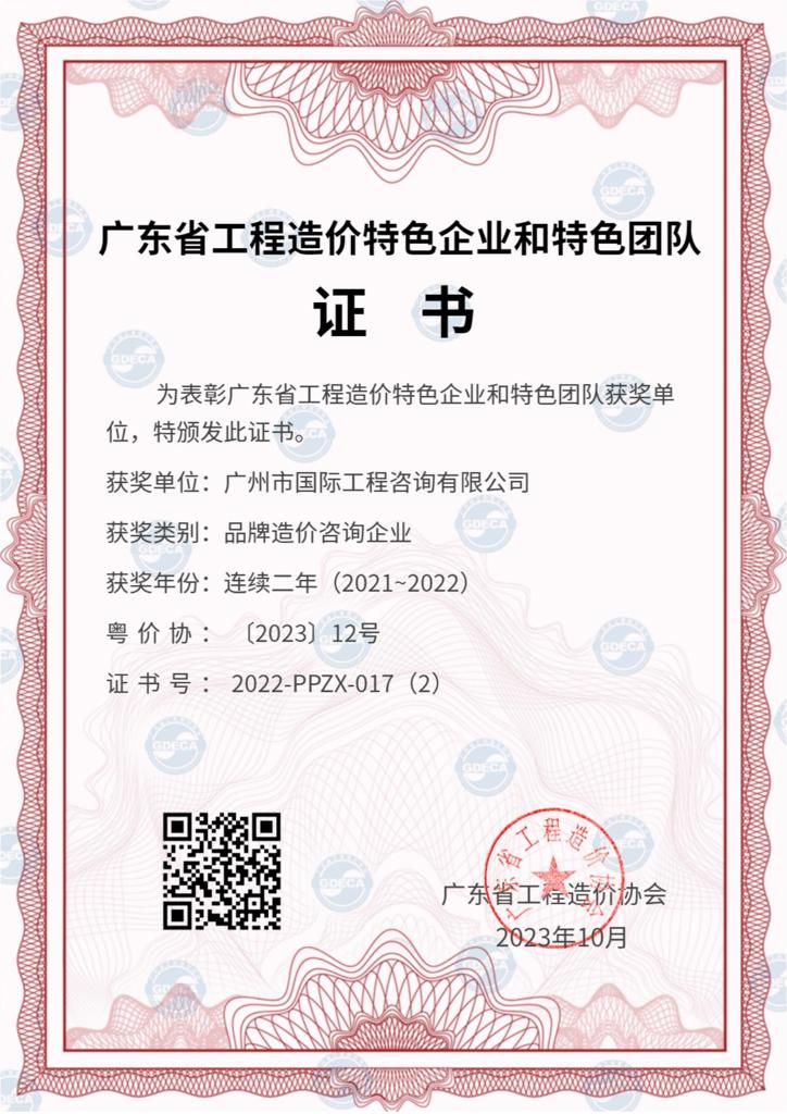 2022年度廣東省品牌造價(jià)咨詢企業(yè)證書
