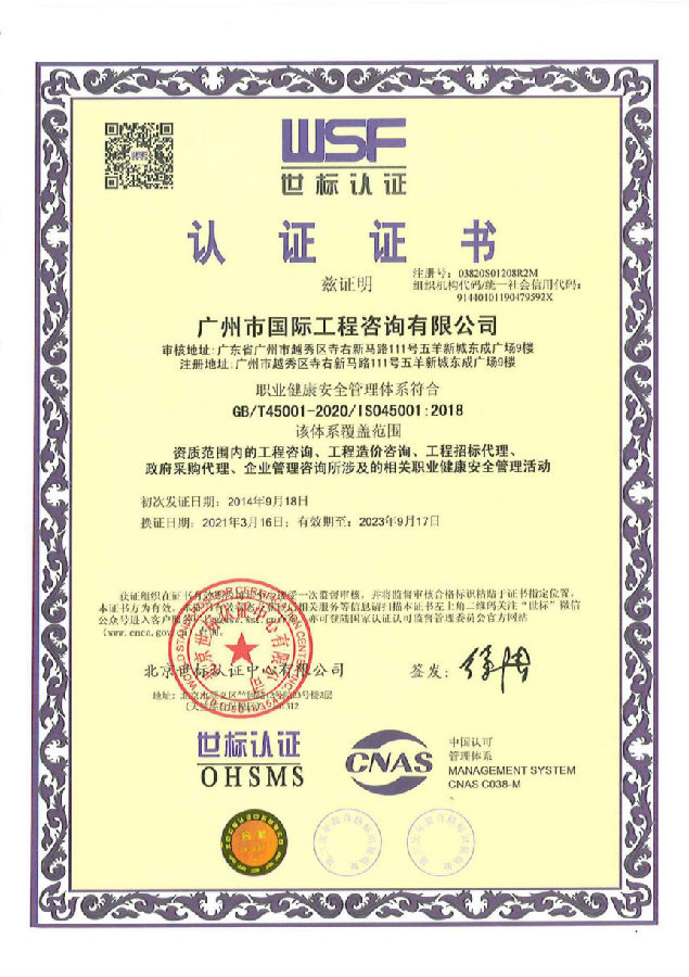 根據質量、環境、職業健康安全管理體系認證機構---北京世標認證中心有限公司的審核計劃書要求,北京世標認證中心有限公司于3月1日至3月2日對我司開展了質量、環境及職業健康安全管理體系換證后第一次監督審核認證工作,審核范圍包括工程咨詢服務、工程招標代理、政府采購代理、企業管理咨詢服務等內容。廣州市國際工程咨詢有限公司的監督審核認證工作于3月2日順利完成,并于3月下旬獲得了質量、環境及職業健康安全管理體系認證證書。