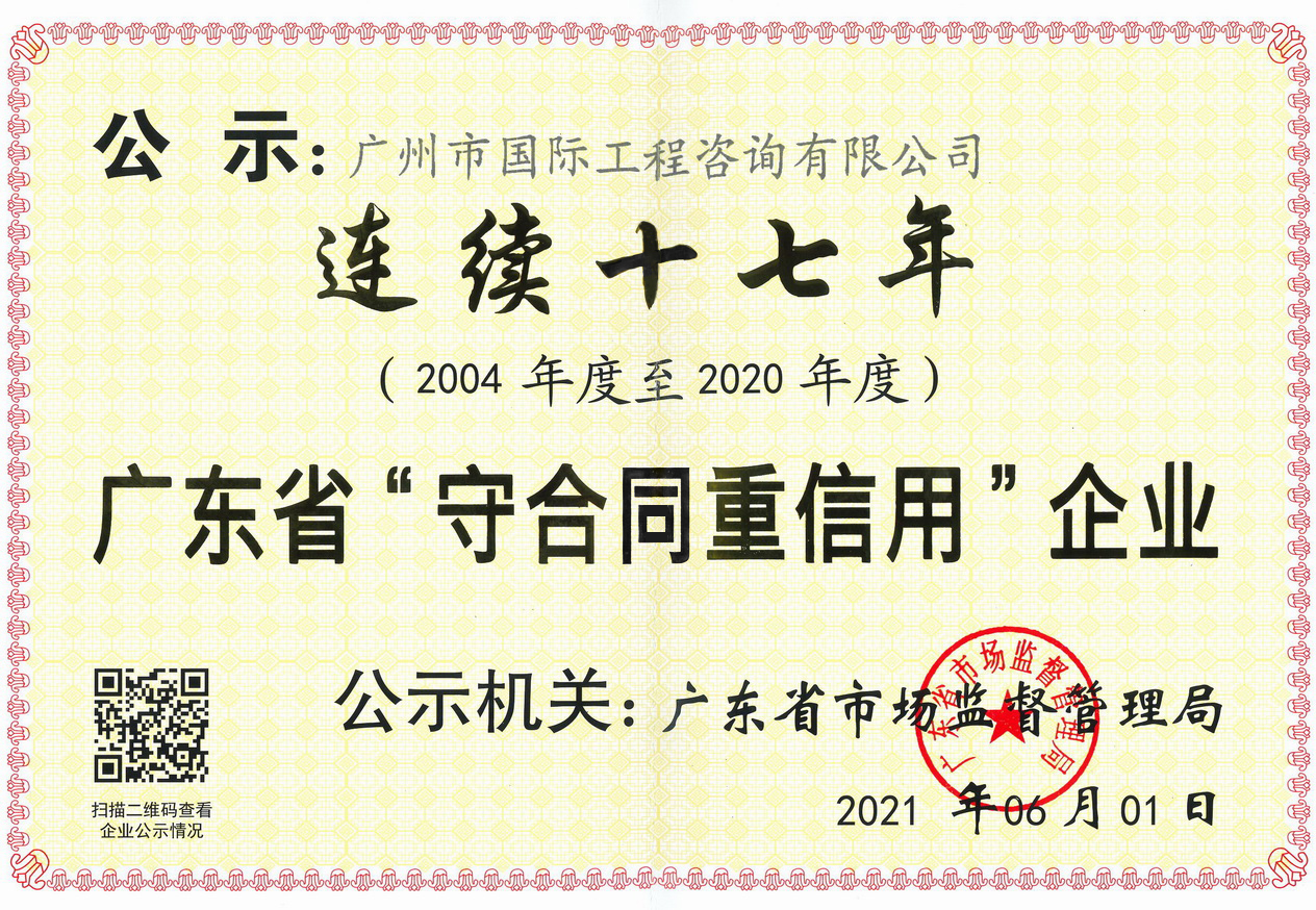 近日,廣州市國際工程咨詢有限公司順利通過廣東省市場監督管理局與廣州市市場監督管理局評審,榮獲“廣東省守合同重信用企業”稱號,這是自2004年以來,我司連續十七年獲頒此殊榮,這也是我司多年守法經營,深入推動誠信建設、堅持誠信履約所取得的重要成果。