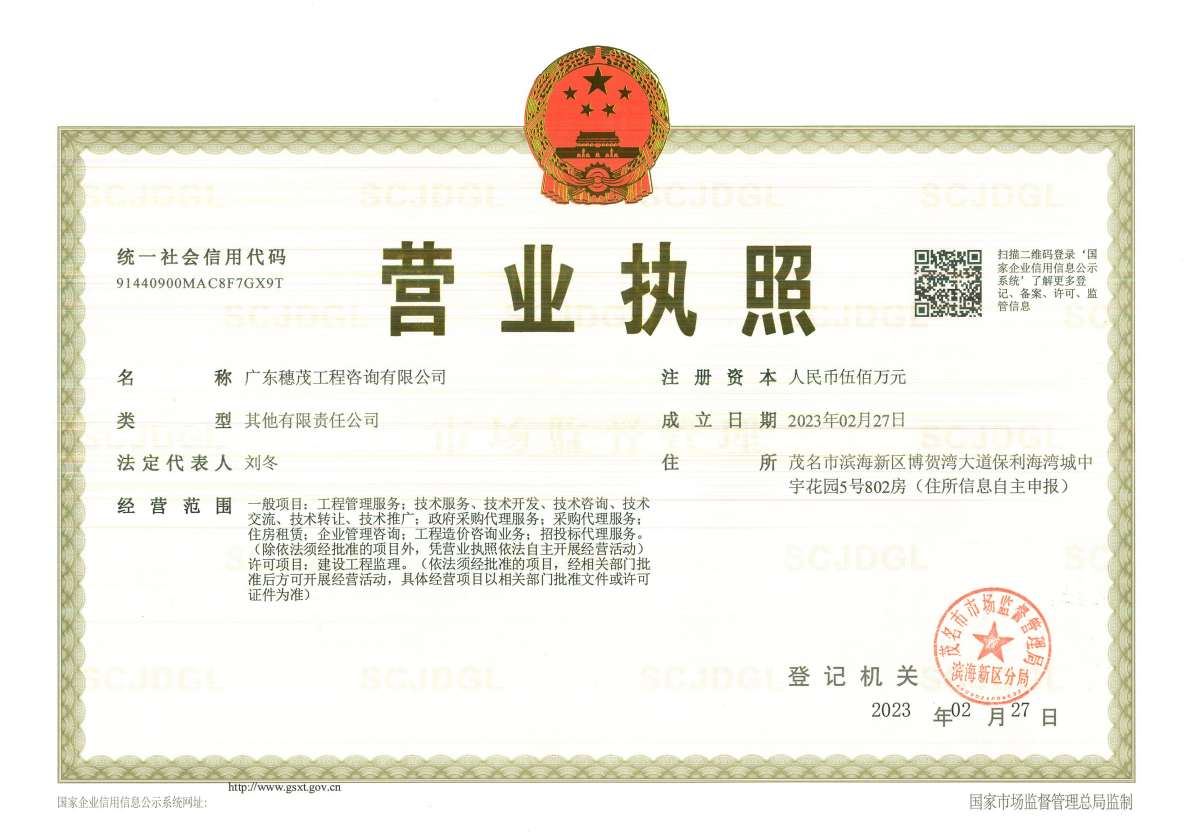 在茂名市人民政府、廣州產業投資控股集團有限公司的關心和大力支持下,廣州國際咨詢公司與茂名港集團共同設立的廣東穗茂工程咨詢有限公司(下稱“穗茂咨詢”)于2023年2月27日在茂名市完成工商注冊。