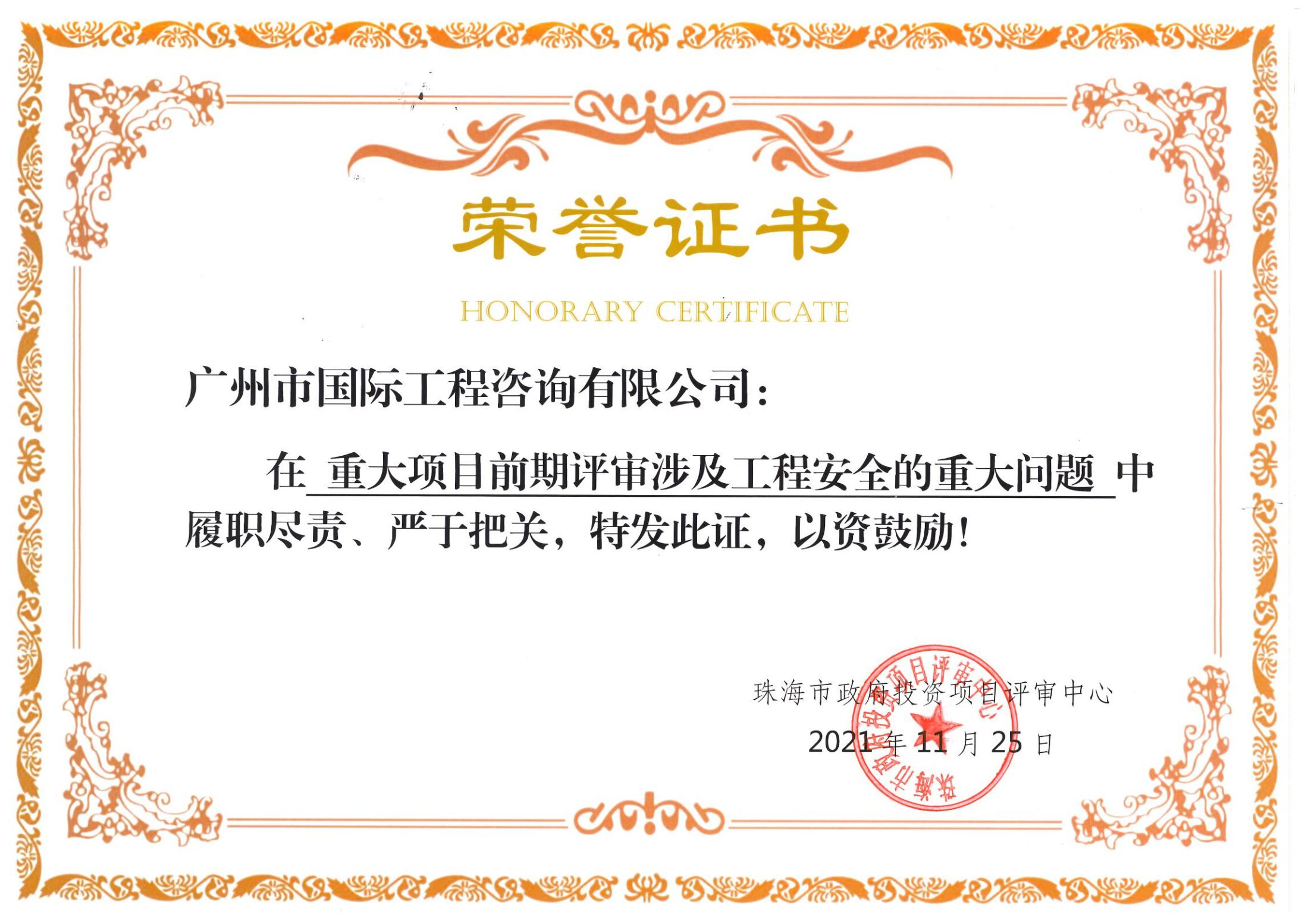 為貫徹落實《國家發展改革委關于加強基礎設施建設項目管理 確保工程安全質量的通知》(發改投資規〔2021〕910號),加強基礎設施建設項目安全質量管理,11月25日,珠海市政府投資項目評審中心主持召開了關于如何進一步加強項目前期評審工作的會議,珠海市發展和改革局、珠海市政府投資項目評審中心、廣州市國際工程咨詢有限公司及其他有關單位代表出席了會議,并對包括我司在內的一眾評審單位進行了表彰。