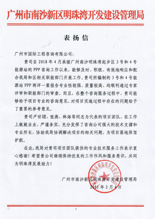廣州市國際工程咨詢有限公司(下稱“廣州國際咨詢公司”)自2018年4月承接3號和4號能源站的PPP咨詢工作以來,歷時近3年時間,在項目邊界數次變更的情況下,及時、積極、有效地響應和配合業主單位和區相關職能部門開展工作。在整個咨詢服務過程中,廣州國際咨詢公司給予項目專業的咨詢意見,并就項目實施PPP模式的前期條件和必要的研究工作給予了重要的參考意見,對PPP項目的順利實施落地起到了承上啟下的關鍵作用。項目團隊在工作上兢兢業業、嚴謹務實,充分發揮了廣州國際咨詢公司強大的技術支撐和專業所長,協助業主單位協調解決項目問題,為項目落地保駕護航。