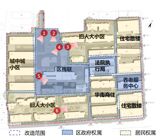 花都區(qū)舊人大小區(qū)建于80-90年代,小區(qū)改造用地面積約35800平方米,建筑總面積約65972平方米,樓棟數(shù)30棟,居民戶數(shù)719戶,無業(yè)委會與物業(yè)單位。小區(qū)地塊內(nèi)部組成復雜,包括舊人大小區(qū)、城中城小區(qū)、區(qū)殘聯(lián)、法院執(zhí)行局、舊人大辦公樓、華南商住、養(yǎng)老服務中心及住宅散樓等。花都區(qū)舊人大小區(qū)具有黨建文化氛圍濃厚、空間充足以及可利用資源基礎良好等優(yōu)勢,適宜作為先行先試的示范項目。2021年3月經(jīng)花都區(qū)政府同意確定將舊人大小區(qū)項目作為花都區(qū)老舊小區(qū)有機更新項目的示范區(qū)。項目實施內(nèi)容主要包括新建立體機械停車樓、利用現(xiàn)狀閑置公房改造成鄰里中心、小區(qū)公共空間(美好會客廳)、兒童娛樂設施、信息標識、充電樁、危房加固、智慧設施及藝術(shù)彩繪。