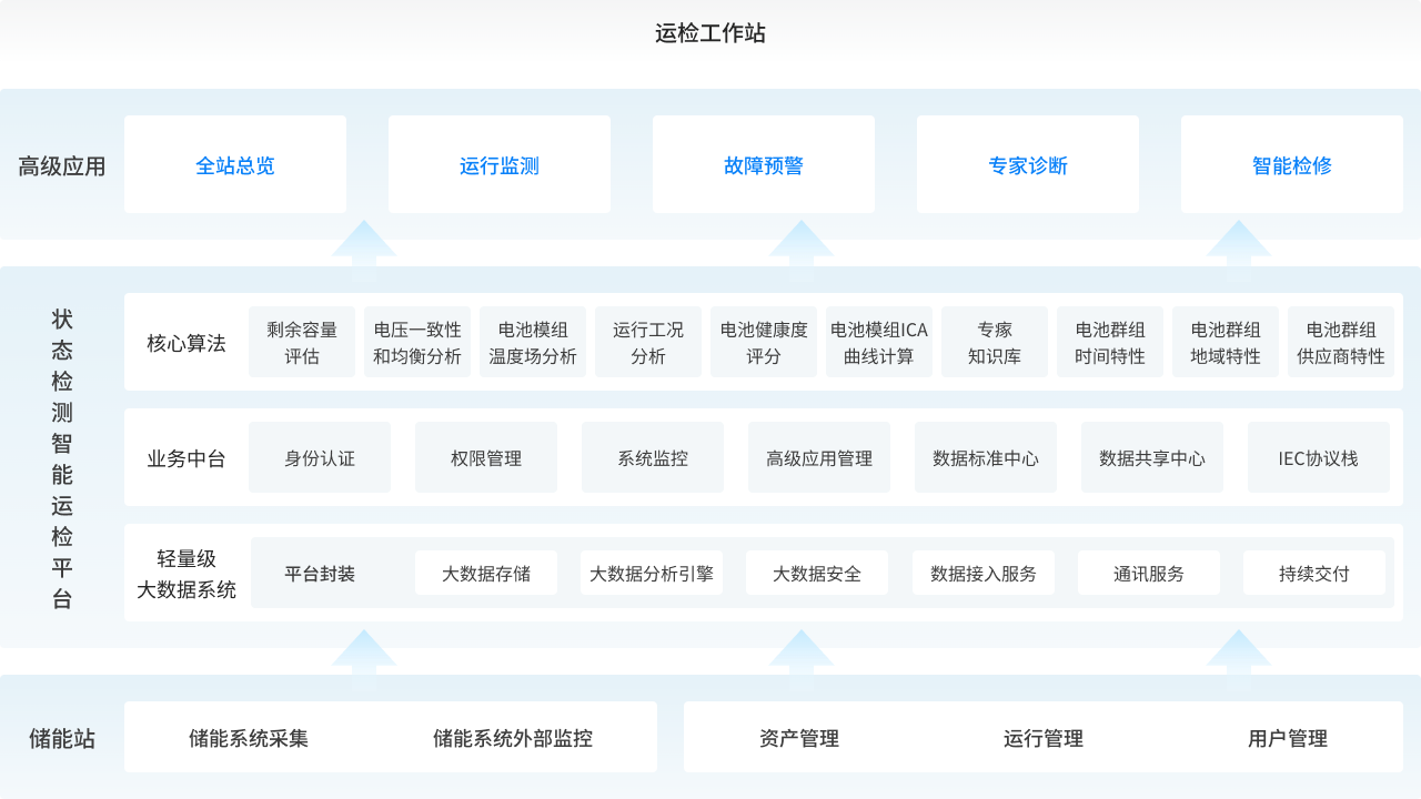 儲(chǔ)能電站安全運(yùn)行風(fēng)險(xiǎn)監(jiān)測(cè)及預(yù)警系統(tǒng)以平臺(tái)層加高級(jí)應(yīng)用層的總體架構(gòu)實(shí) 現(xiàn),通過(guò)數(shù)據(jù)管理平臺(tái)實(shí)現(xiàn)對(duì)物聯(lián)網(wǎng)層儲(chǔ)能系統(tǒng)的 數(shù)據(jù)采集,實(shí)現(xiàn)全站概覽、 運(yùn)行監(jiān)測(cè)、故障主動(dòng)安全預(yù)警、故障專(zhuān)家診斷以及 智能檢修管理等高級(jí)應(yīng)用。
